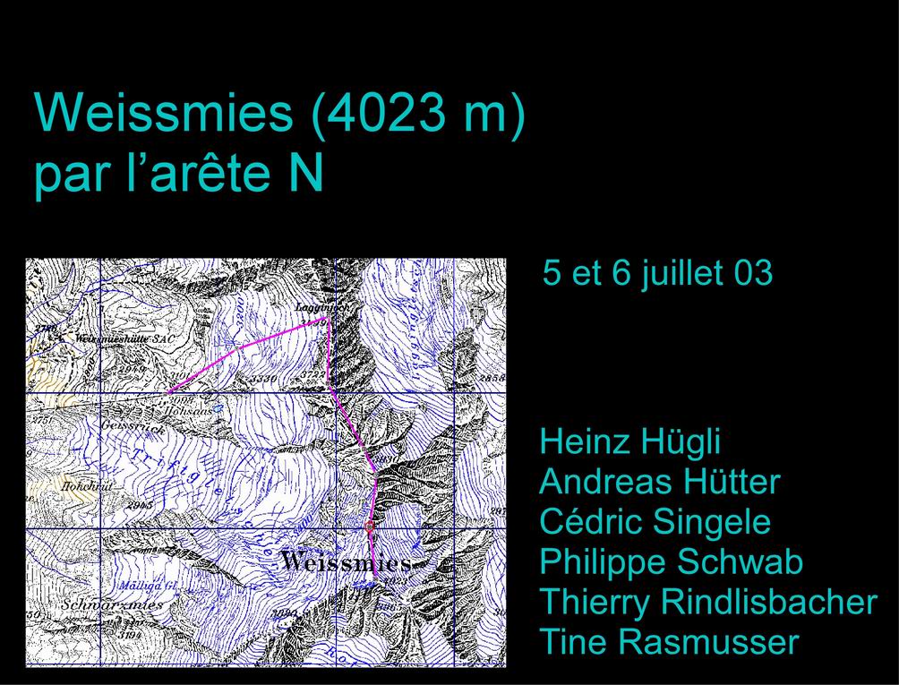 Partie le samedi 5 juillet 2003 pour Saas-Grund, notre équipe de 6 prend les télécabines et arrive sans effort à Hohsaas, où de nombreux autres alpinistes se retrouvent pour la nuit et tenter le lendemain l'ascension du Weissmies. |