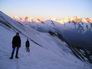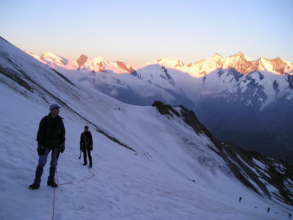 La montée du glacier se fait tôt le dimanche matin alors que derrière nous, s'embrase la chaîne des Mischabel sous le feu des premiers rayons de soleil. |