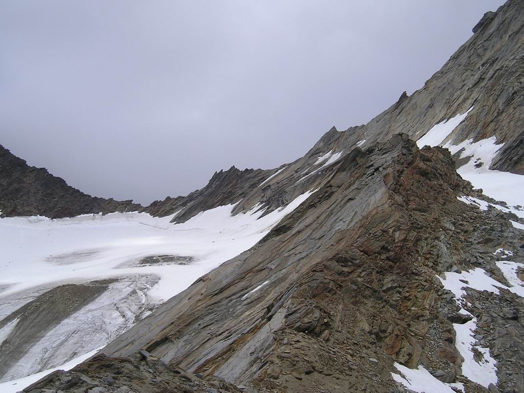 L'arête N du Weissmies prend naissance au Lagginjoch et a tout de suite des allures aériennes. |