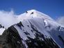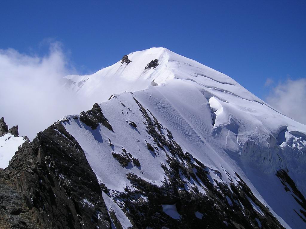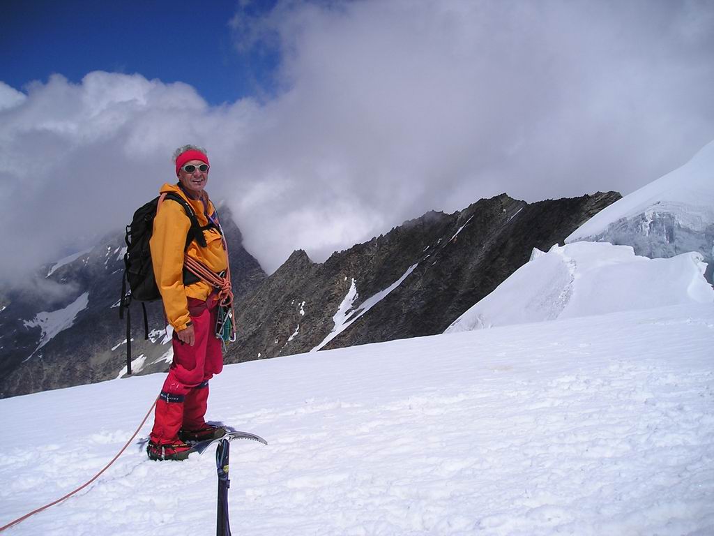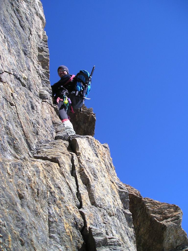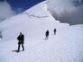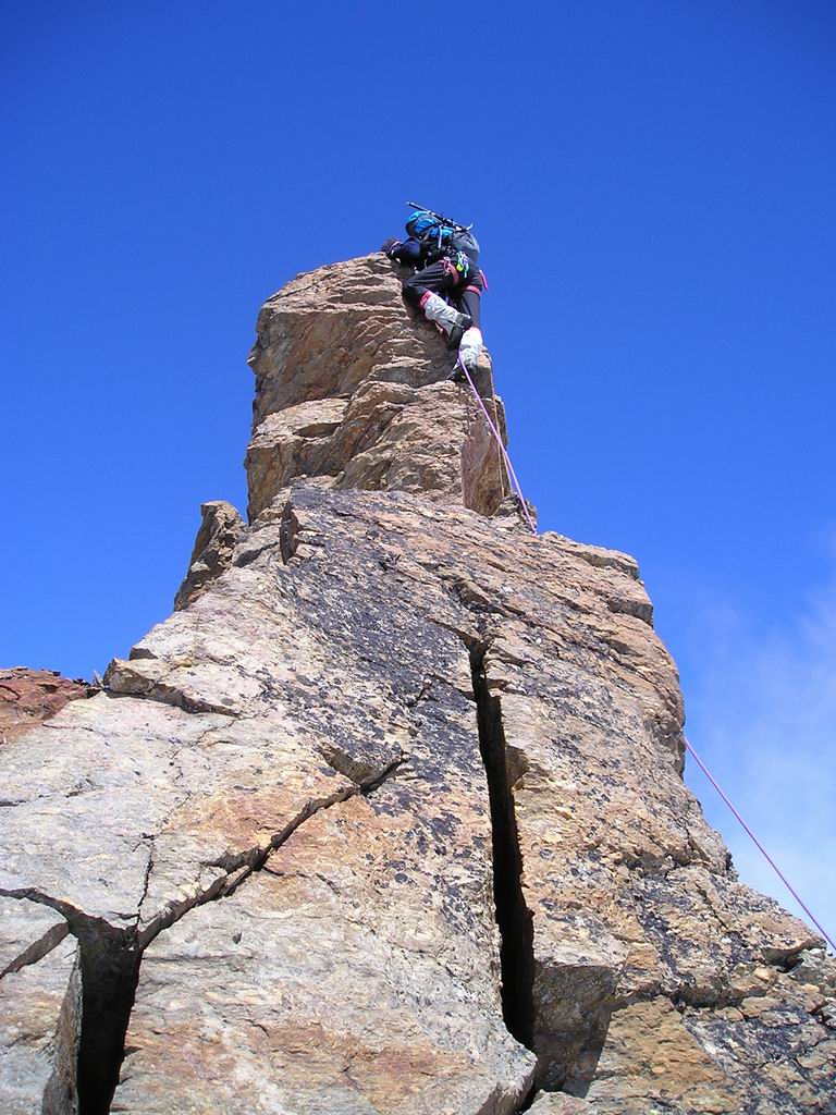 La fin de l'itinéraire rocheux débouche sur une magnifique partie neigeuse qui conduit directement au sommet à 4023 m. Sur l'arête opposée, on voit évoluer de longs convois d'alpinistes engagés dans la voie normale. Dans notre propre voie, une seule autre cordée s'y est engagée avec nous. |