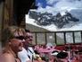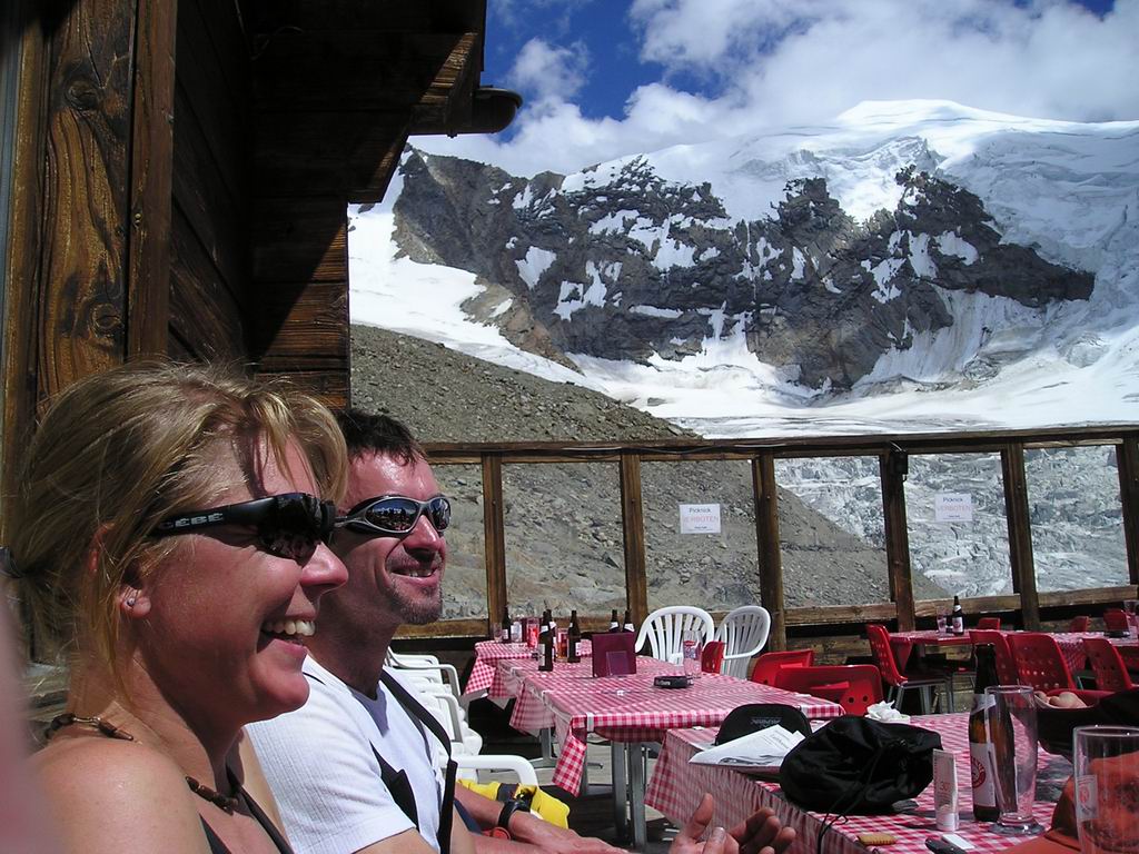 Au retour à la cabane de Hohsaas, arrêt sur la terrasse ensoleillée pour admirer de loin le sommet traversé et avaler une bibine bien fraîche. |